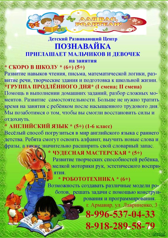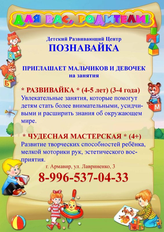 Здесь с любовью развивают интеллект ребятишек и готовят их к самостоятельной жизни в новой информационной эпохе. Педагоги не просто занимаются адаптацией к детскому саду и школе, уча разным навыкам и техникам социализации. Именно после таких занятий дети начинают осознавать себя как самостоятельные личности и уже в нежном детстве начинают осознавать, чем хотят заниматься в будущем. Не стоит экономить на времени и развитии ваших детей, они - это ваше будущее. Детский центр Познавайка представляет собой проверенное место, где готовы развивать способности ваших детей, обучать их навыкам коммуникаций, предоставлять пример настоящей дружбы, а также учить их не избегать всех препятствий, которые могут встретиться в жизни.